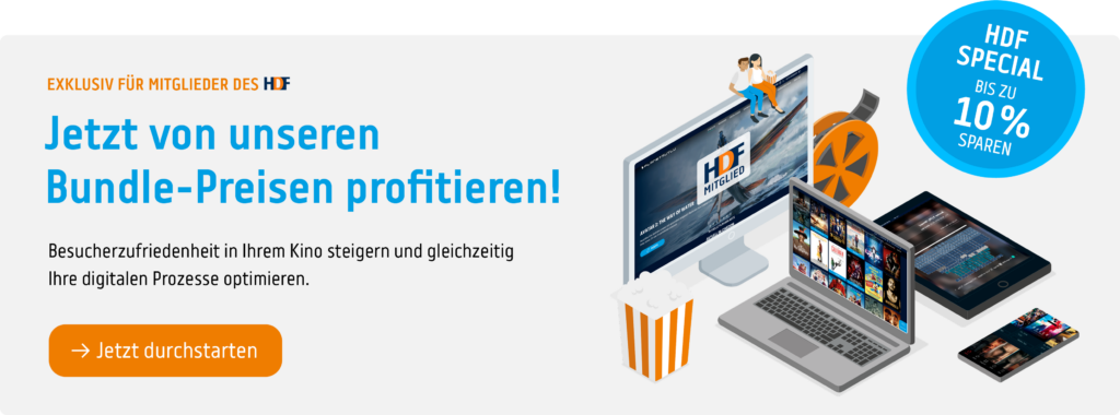 Sind Sie als HDF-Mitglied auf der Suche nach innovativen Lösungen, um die Besucherzufriedenheit in Ihrem Kino zu steigern und gleichzeitig Ihre digitalen Prozesse zu optimieren? Gemeinsam mit dem HDF haben wir einzigartige Bundle-Preise erarbeitet.